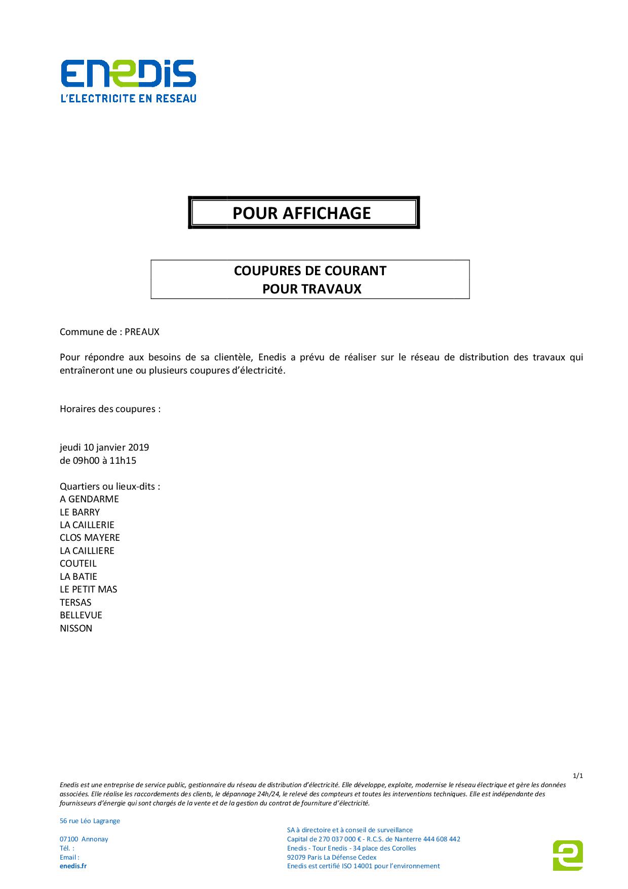 coupure d’électricité le 10 janvier 2019